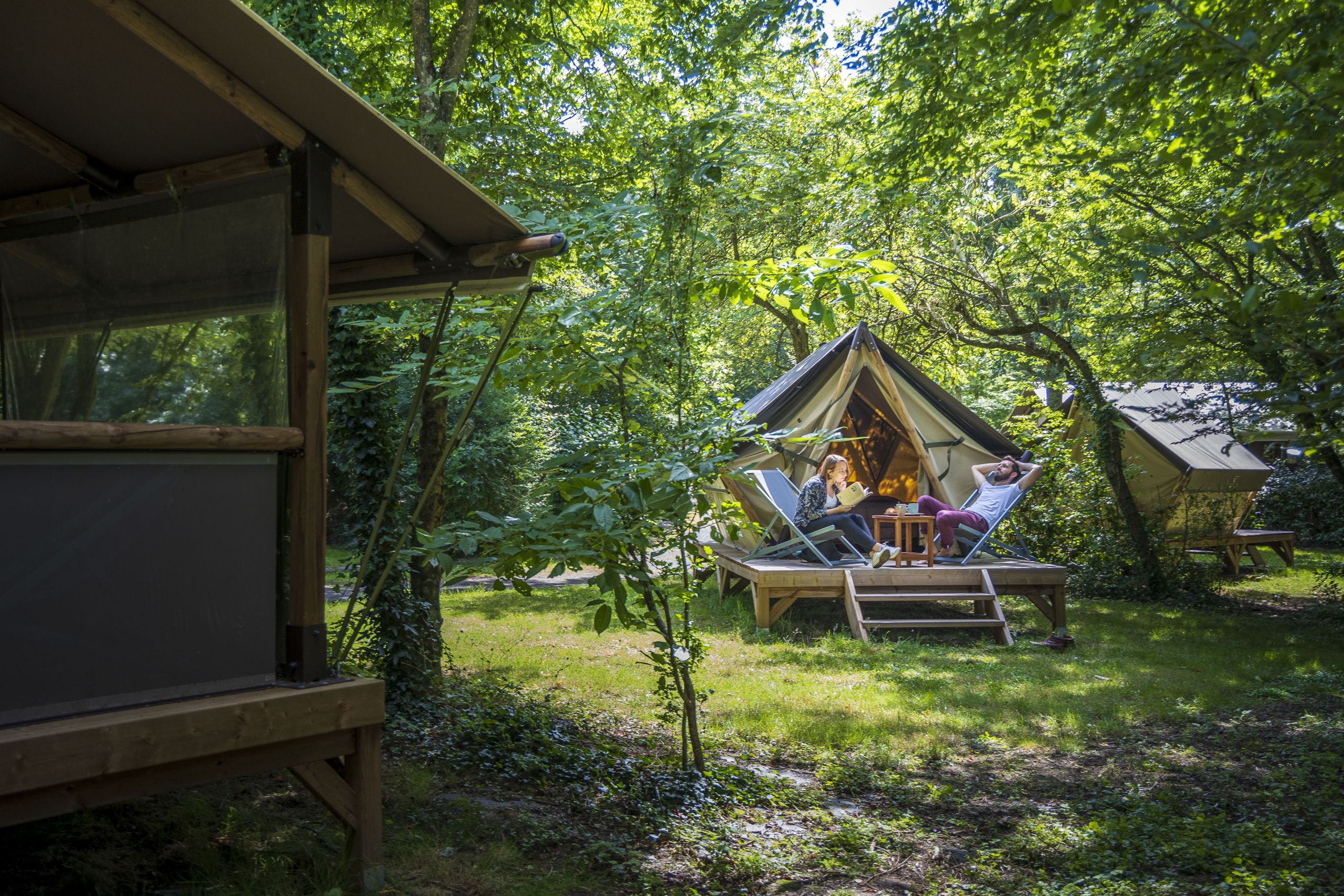 Equipé pour toute la famille, ce lodge spacieux de 45m² construit en bois et toile, séduit par son positionnement sur les meilleurs emplacements de notre camping nature face à l’étang. Arrivez seulement avec vos valises (les jours de départs et d’arrivées sont libres), les vacances en famille ou entre amis peuvent commencer. La belle terrasse bois couverte (11m²) accueillera tous vos repas dans la plus grande convivialité. À l’intérieur, retrouvez une ambiance chaleureuse, avec grandes ouvertures sur les côtés pour un contact direct avec la nature et une vraie literie confortable pour tous. Les tentes sont installées sur des emplacements de plus de 100m², accessibles avec votre véhicule. Les sanitaires se situent à moins de 50m.